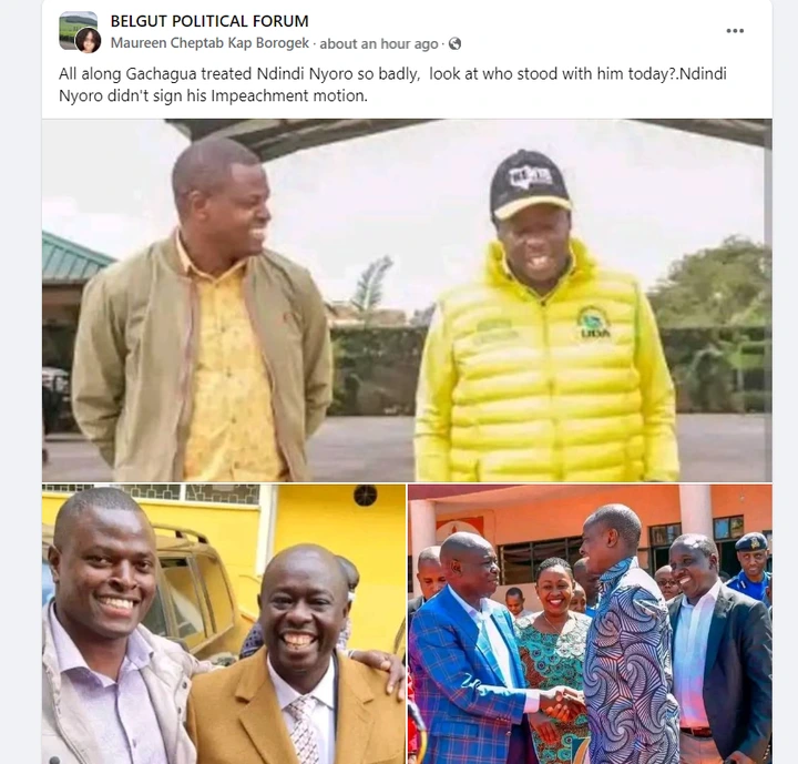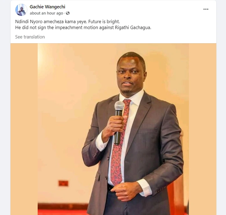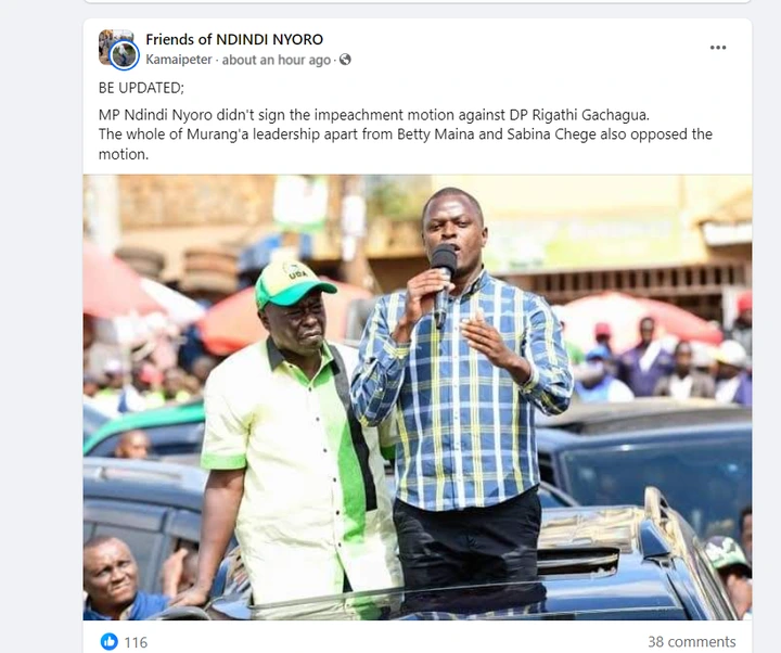 Nyoro had been one of the vocal MPs against Rigathi Gachagua in the region and has been one o Ruto's most trusted foot soldiers from the Mt Kenya region. But the absence of his name from the list supporting Gachagua's impeachment raised suspicions from Kenyans, who wondered why the UDA MP had not availed his name
